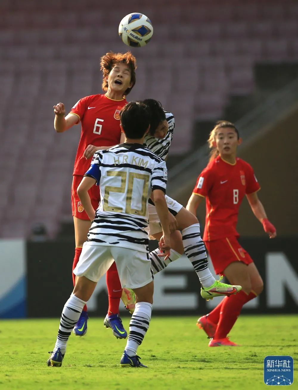 2月6日,中国队球员张馨(上)在比赛中争顶。新华社发(贾韦德·达尔 摄)