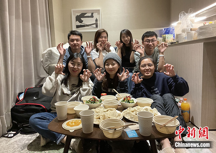北京语言大学的澳门学生苏嘉怡今年作为北京冬奥会志愿者,首次在京过年。图为苏嘉怡(前排左一)除夕与部分志愿者一起吃年夜饭。(中新社发 受访者供图)