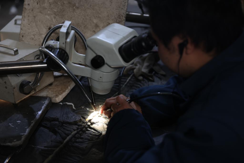 在昏暗的房间里,气动笔发出嗡嗡声响,修复师们专心致志一点一点剥去岩板上的岩石,揭开远古生命的面纱。