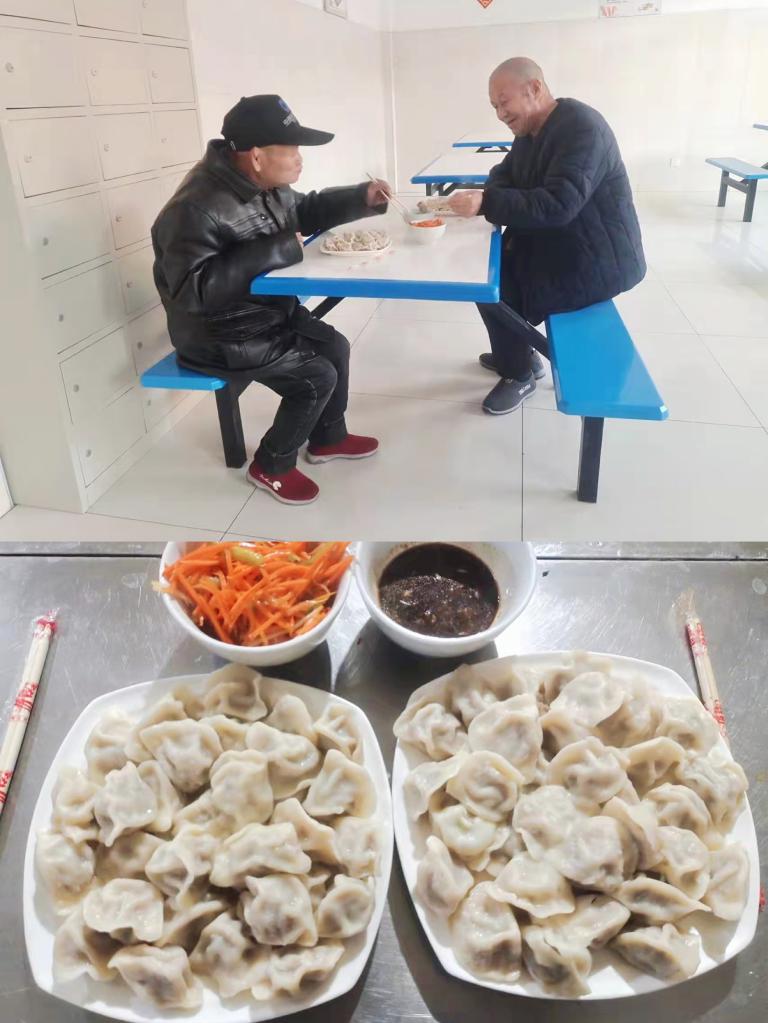 除夕夜,刘银汉(上图右)和丁玉强(上图左)吃上了热腾腾的羊肉饺子。(受访者供图)
