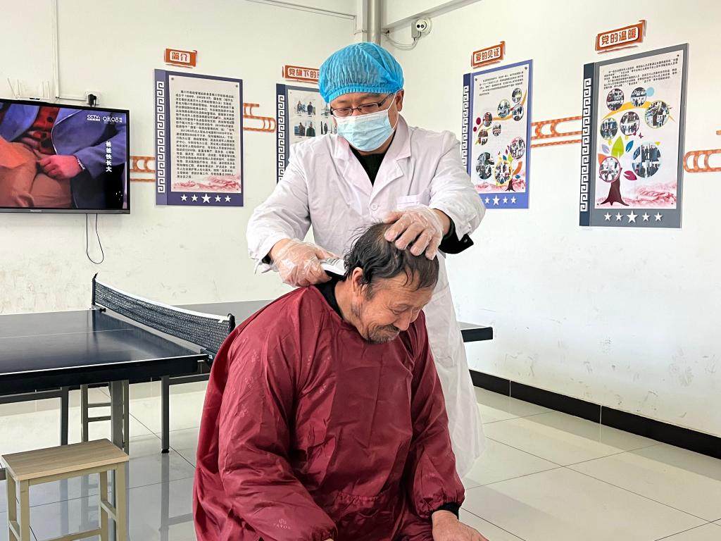 春节前,银川市救助管理站的工作人员帮刘银汉理发。(受访者供图)