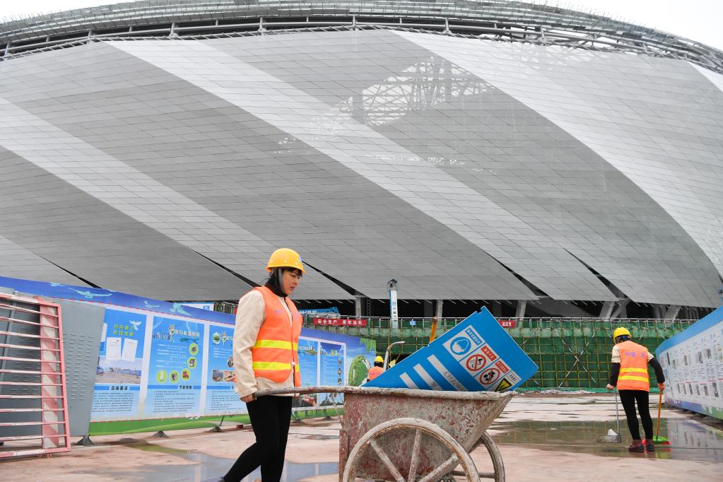 2月7日,重庆龙兴足球场项目建设现场,工作人员正在进行清扫工作,为全面复工做准备。新华社记者王全超 摄