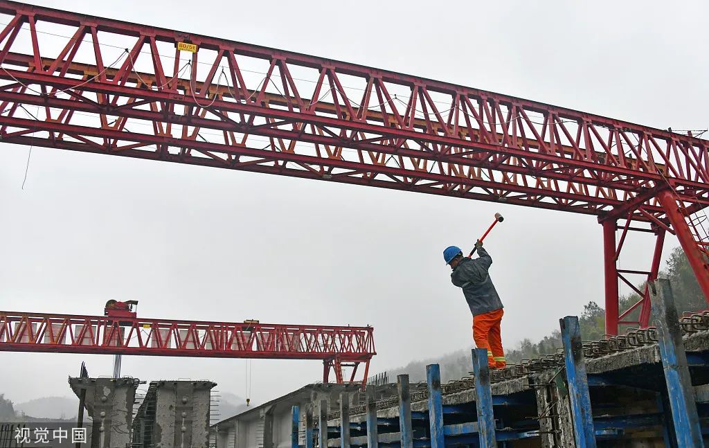 2022年2月7日,在浙江S319省道台州市仙居县建设现场,工人正在施工。