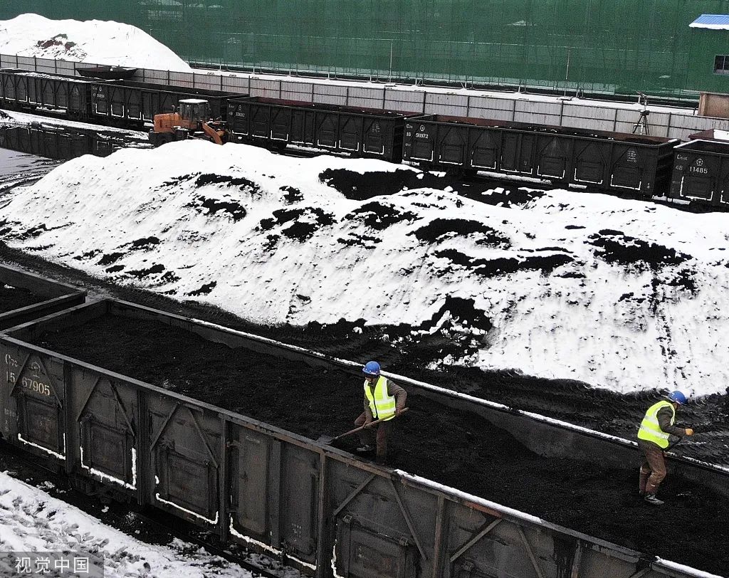 2022年2月7日,江西九江,七里湖站铁路专用线,工人们正在平整电煤。