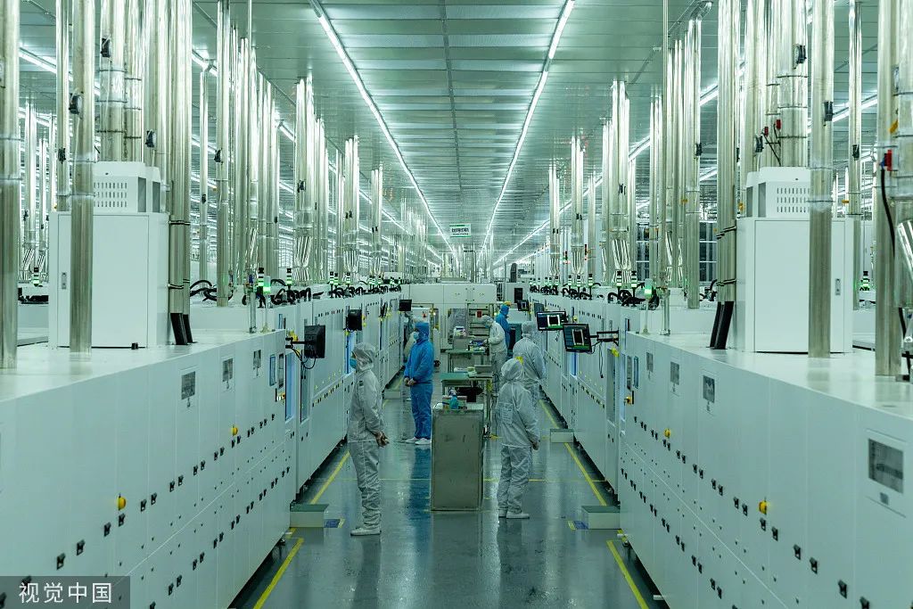 2022年2月7日,合肥,肥东县合肥循环经济示范园内的某生产车间,工人在光伏电池片丝网印刷机前忙碌。