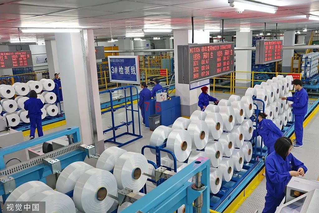 2022年2月7日,江苏南通,通州区开沙岛上的产业园,二期年产60万吨POY纺丝项目满负荷忙碌有序生产。