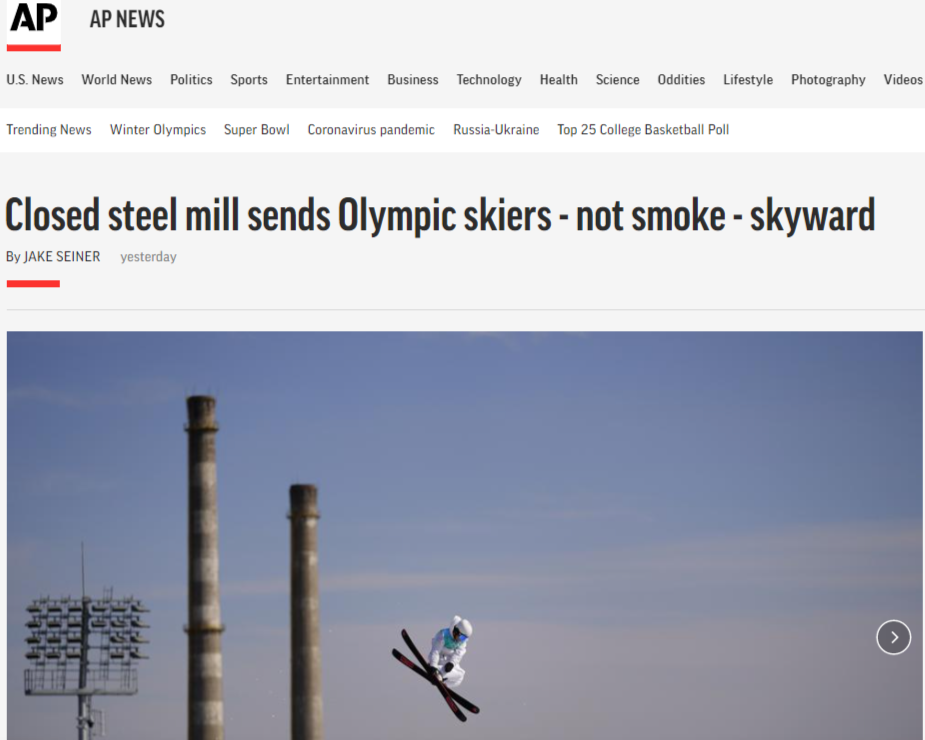 美联社报道称,关闭的钢铁厂让奥运滑雪运动员飞翔上了天空。“感觉就像我们在山中,”瑞典选手奥利韦尔·芒努松说。