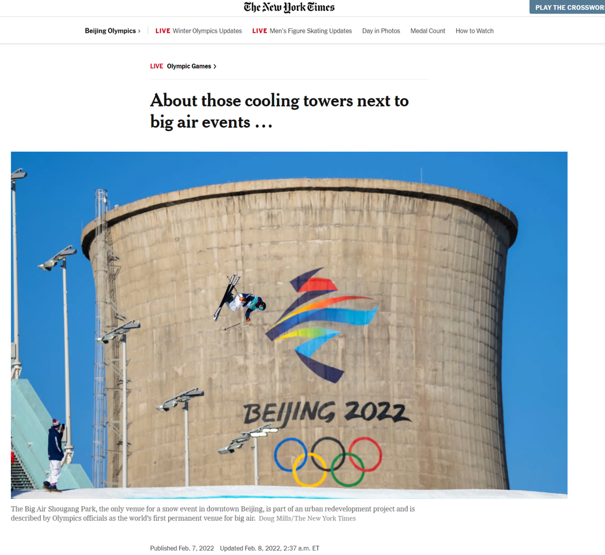 美国《纽约时报》介绍说,北京冬奥会最引人注目的比赛场地位于北京西部的老工业区,用于空中滑雪比赛的高耸大跳台以4个70米高的冷却塔为背景。