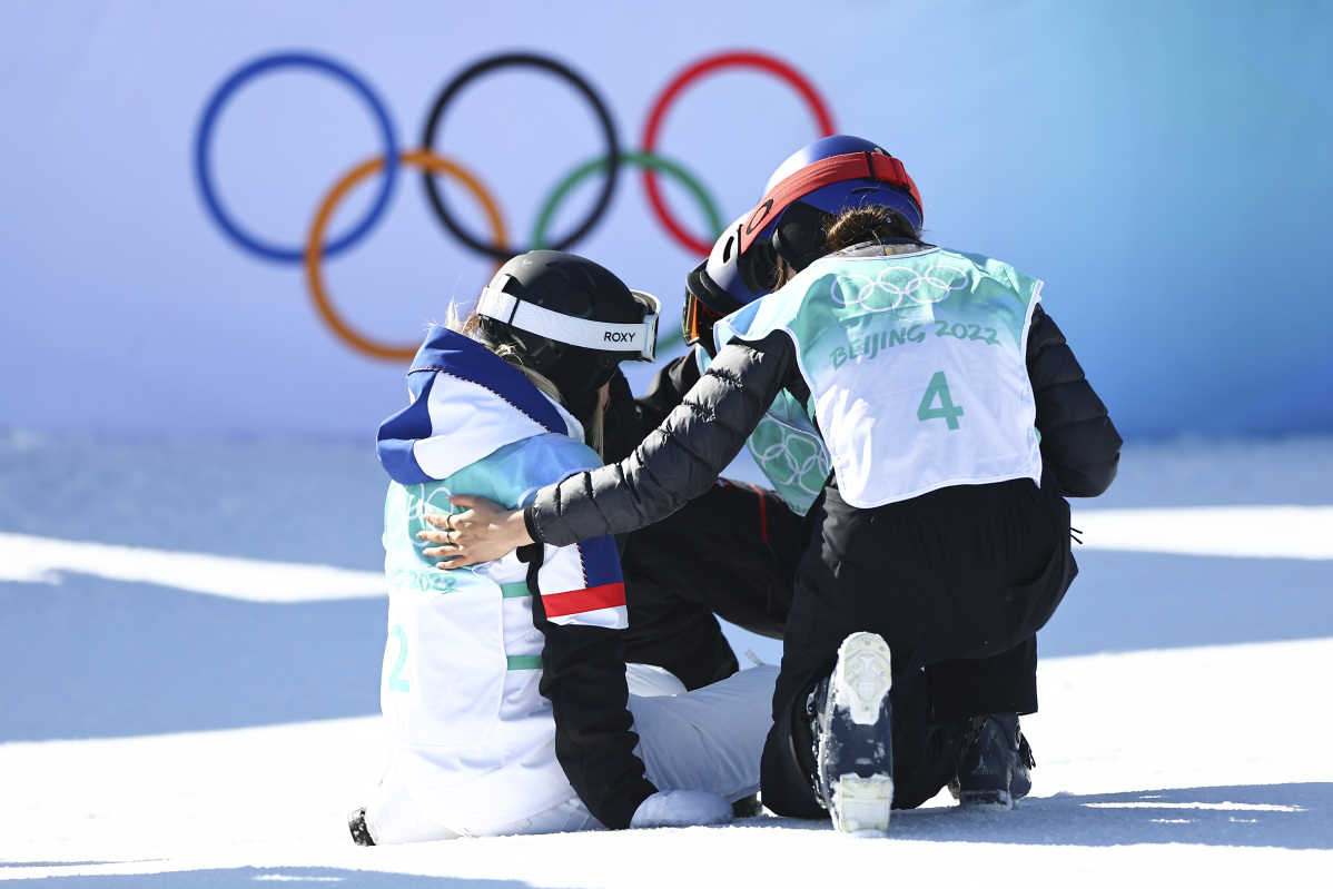 2022年2月8日,北京冬奥会自由式滑雪女子大跳台决赛,谷爱凌、格雷莫德安慰勒德。 图片来源:IC photo
