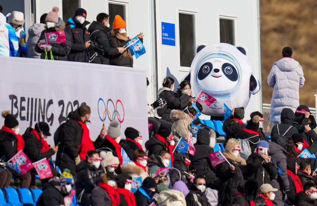 2月6日,2022年北京冬奥会越野滑雪男子双追逐比赛中,吉祥物“冰墩墩”在现场与观众互动。新华社记者刘潺摄