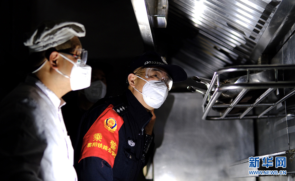 乘警蒋大兵检查列车餐车消防安全情况。新华网发 贺瑞明摄