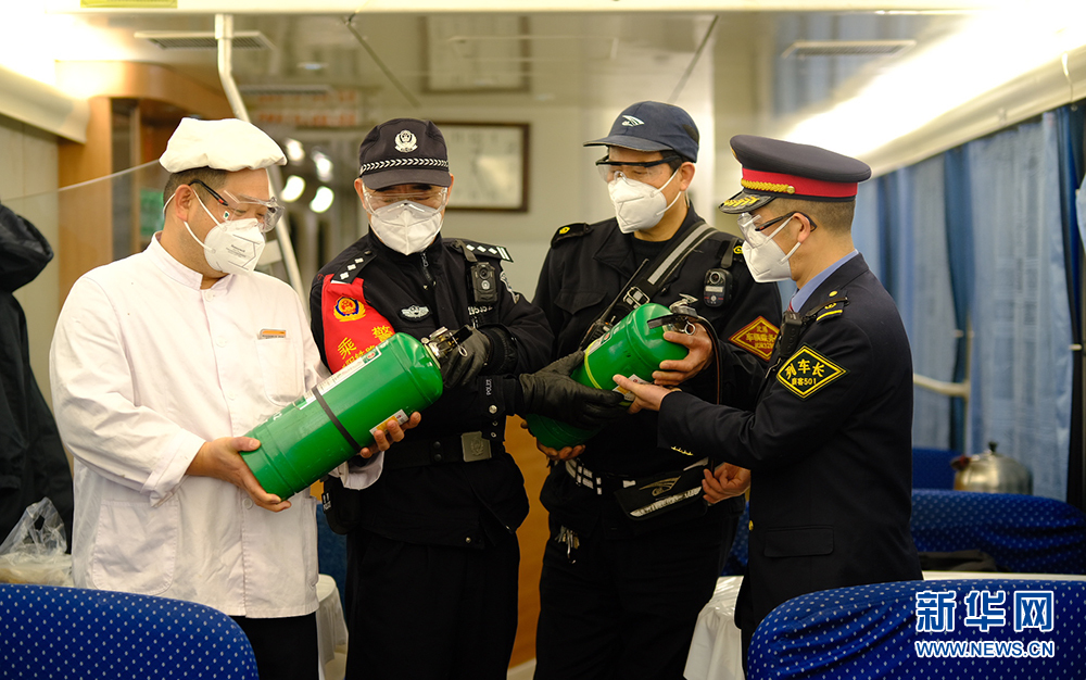 乘警蒋大兵与列车工作人员检查消防器材。新华网发 贺瑞明摄