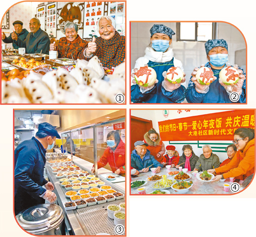 图①:山东省荣成市俚岛镇大庄许家村暖心食堂,老人们在用餐。李信君摄(影像中国)图②:河北省平山县西柏坡镇北庄村团结食堂,工作人员展示特色面食。新华社记者 骆学峰摄图③:上海市普陀区曹杨新村街道的幸福饭堂饭菜供应丰富。本报记者 巨云鹏摄图④:江苏省连云港市海州湾街道大港社区食堂,老人们正在享用年夜饭。王健民摄(影像中国)