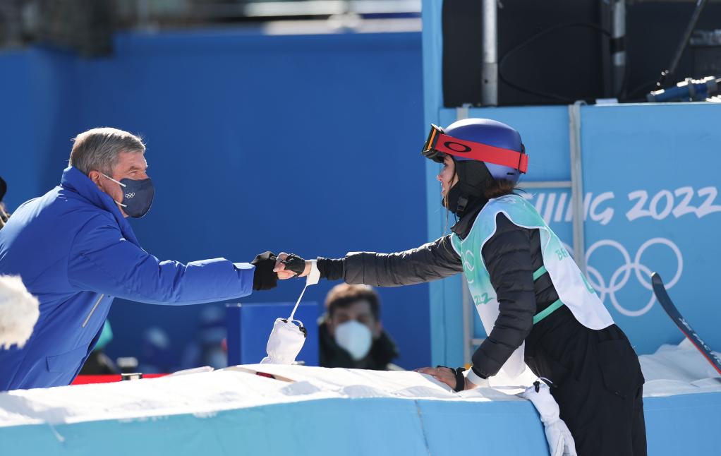 2月8日,国际奥委会主席巴赫(左)向中国选手谷爱凌表示祝贺。新华社记者丁旭摄
