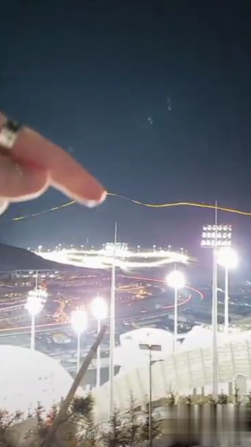 她一脸兴奋地说:“我要给大家看个很厉害的东西,在雪如意跳台旁边不远处,有一条亮着光带的山脊,那不是别的,就是万里长城!”并感叹“真是太酷了!”