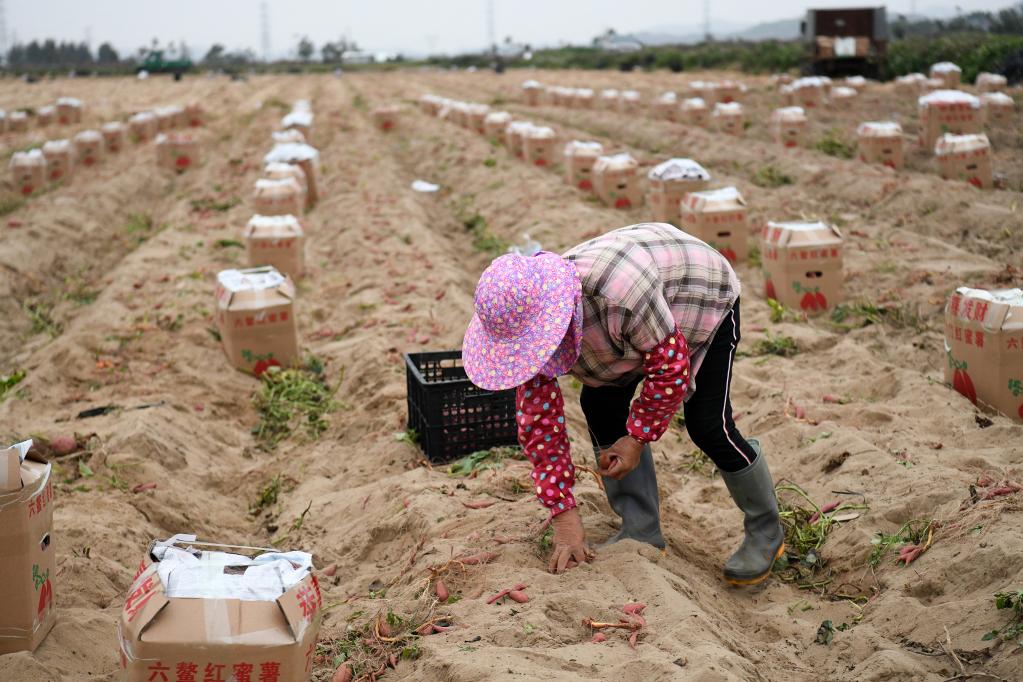 2月9日,在陆丰市碣石镇滴水村,农民在田里收甘薯。新华社记者梁旭 摄