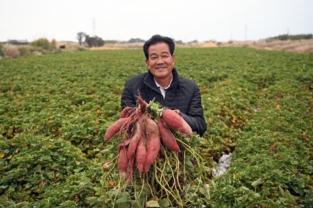 2月9日,陆丰市碣石镇戴厝村村民戴胜友在田里收获甘薯。新华社记者梁旭 摄