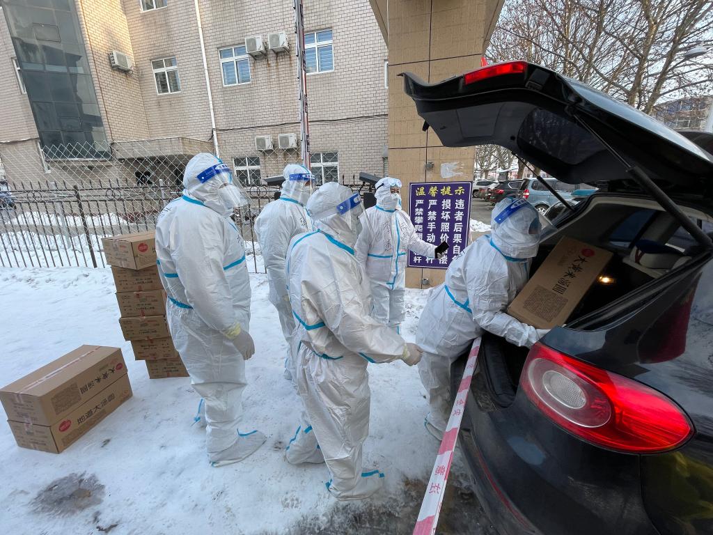 辽宁省葫芦岛市绥中县农电小区的防疫人员在搬运为小区居民准备的汤圆。(新华社记者李昂摄)