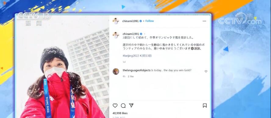 2月13日,北京迎来虎年第一场雪。日本冰壶运动员吉田知那美在社交平台上发布了一张自拍照,吉田知那美感慨道:“参加了三次冬奥会,这是我第一次在冬奥会期间看见下雪。”吉田还发文向志愿者表示感谢:“一大早就在酷寒中努力铲雪的冬奥村志愿者们,非常感谢你们。”她特意用中文写了“谢谢”两字。