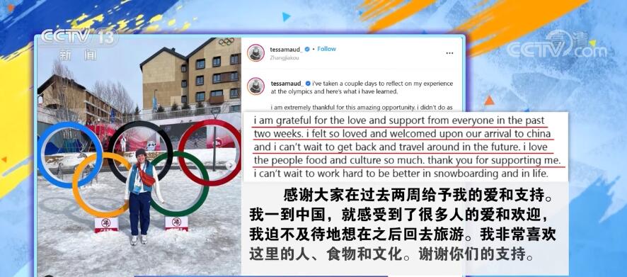 央视网消息:北京冬奥会期间,各国运动员在社交媒体上频频向网友们分享自己冬奥的美好经历,一些已经完赛回国的运动员还表达出对中国、对北京的留恋与不舍。