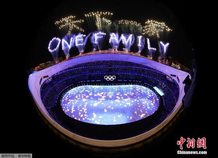 2月20日,北京2022年冬奥会闭幕式在国家体育场“鸟巢”正式拉开帷幕。图为闭幕式尾声烟花秀:天下一家。