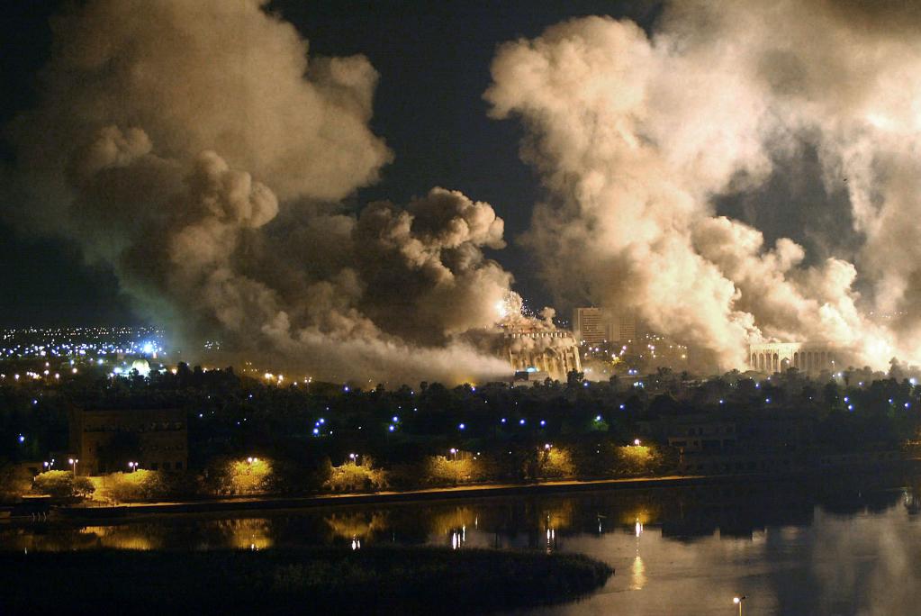 这是2003年3月21日,在美军的空中打击下,伊拉克首都巴格达的总统府硝烟弥漫。(新华社发)