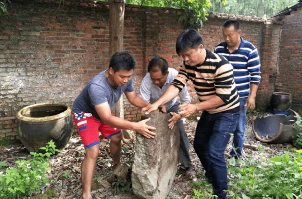 “西迁人”爱国奋斗先进事迹报告团成员林舒进(左一)在贫困户家帮忙。受访者供图