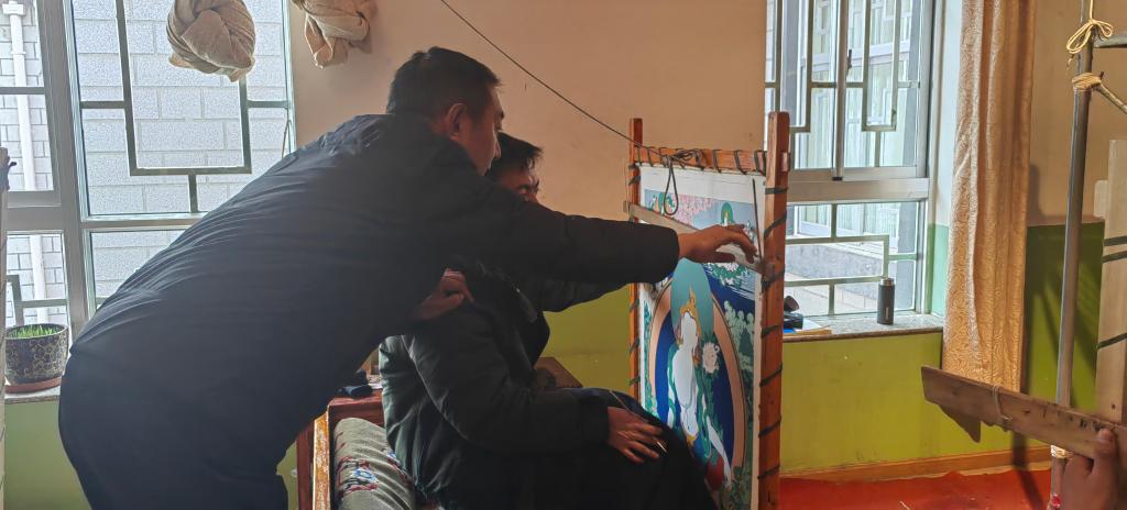 罗布斯达正在指导学生绘制唐卡。 新华社记者 范帆 摄