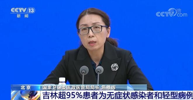 国家卫健委医政医管局局长 焦雅辉:吉林省这次病例主要集中在长春市和吉林市两个地方,我们采取了分类救治的措施。所谓“分类救治”就是把普通型、重型、危重型病例,以及有高风险因素的,比如年纪比较大、有基础疾病的病例,集中收治在综合能力比较强的定点医院,其他的无症状感染者、轻型病例收治在其他定点医院以及方舱医院。吉林省截至今天上午在院病例8201例,其中吉林市危重型2例、重型2例,长春市重型2例,普通型占比大概是4%左右,也就是说95%以上的患者是无症状感染者和轻型病例。我们在第一时间向长春市和吉林市派出了国家专家组,指导吉林市和长春市的医疗救治工作,在吉林市针对医疗救治力量相对较弱的情况,我们也派出了国家医疗队,从黑龙江调派了一支重症的医疗队,从河南、内蒙和江西调派了3支普通医疗队,同时从辽宁调派了救护车辆支援吉林市的病例转运工作。