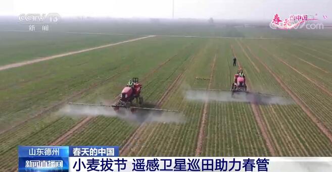 我们现在看到的是山东德州武城县的一家粮棉种植合作社托管的2.5万亩小麦,目前,小麦已进入拔节期。当地为所有托管地块建立了档案,并利用遥感卫星,可24小时监测小麦的生长状况以及病虫害的情况,线上、线下巡田,为农户定制科学、精确的小麦水肥管理方案。智慧赋能,对症施药,助力稳产增产。