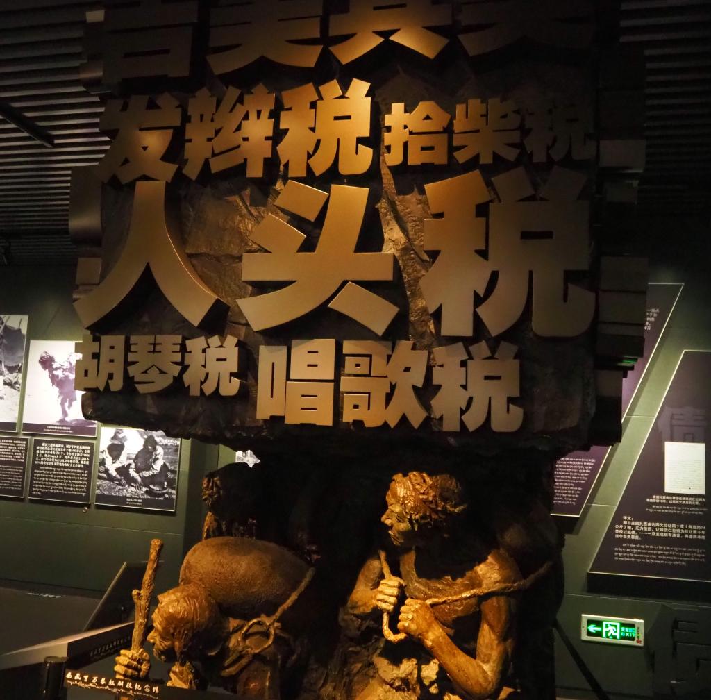 这座占地2700平方米的展馆里,陈列着反映旧西藏苛捐杂税的雕像,也陈列着旧时农奴被囚禁虐待的惨状。