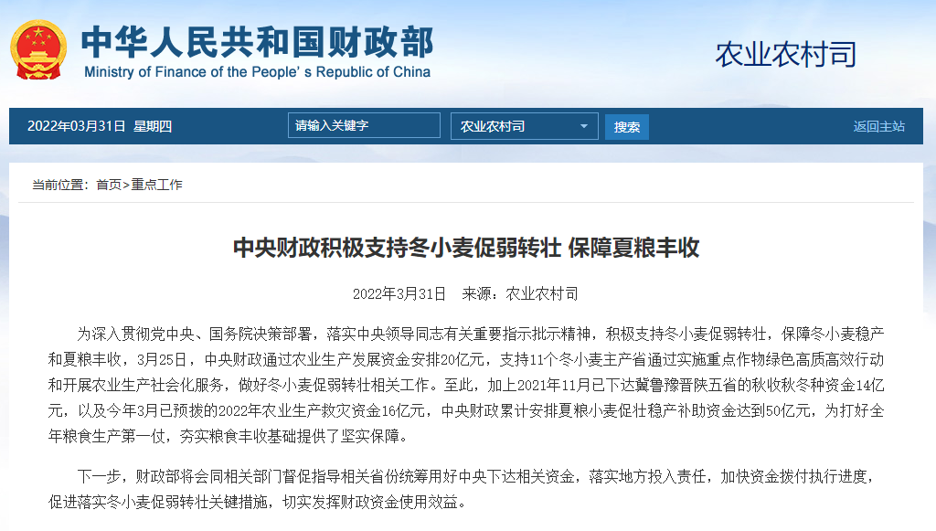 据财政部最新消息:为积极支持冬小麦促弱转壮,保障冬小麦稳产和夏粮丰收,3月25日,中央财政通过农业生产发展资金安排20亿元,支持11个冬小麦主产省通过实施重点作物绿色高质高效行动和开展农业生产社会化服务,做好冬小麦促弱转壮相关工作。至此,加上2021年11月已下达冀鲁豫晋陕五省的秋收秋冬种资金14亿元,以及今年3月已预拨的2022年农业生产救灾资金16亿元,中央财政累计安排夏粮小麦促壮稳产补助资金达到50亿元,为打好全年粮食生产第一仗,夯实粮食丰收基础提供了坚实保障。