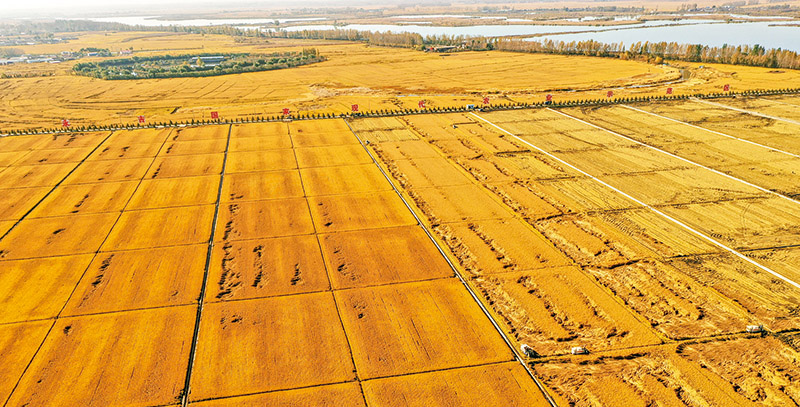 党的十八大以来,我国农业综合生产能力上了大台阶。2021年,全国粮食总产量达到13657亿斤。图为2021年10月12日,吉林省吉林市永吉县万昌镇农民在驾驶农机收割水稻。 新华社记者 张楠/摄
