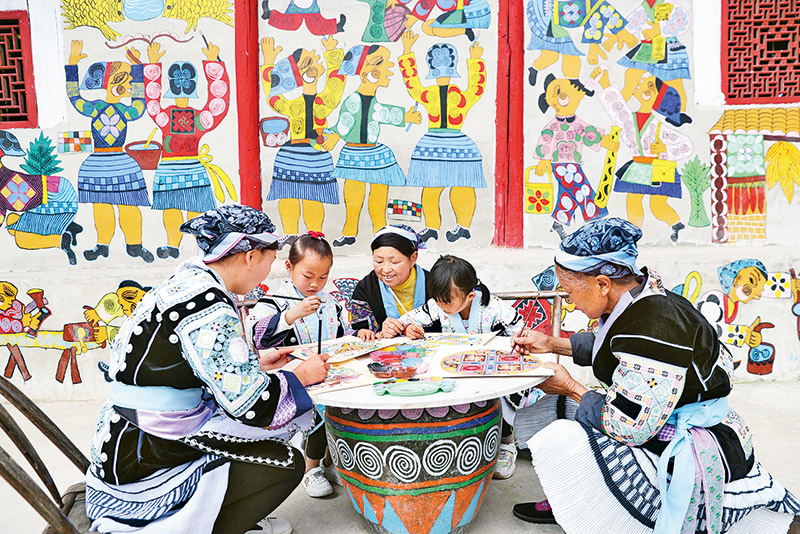 苗画是反映苗族群众生活方式和民俗文化的一种艺术形式。近年来,贵州省黔南布依族苗族自治州龙里县大力发展苗画产业,鼓励苗族群众利用苗画闯市场,传承民族特色文化,推动乡村振兴。图为2022年3月19日,龙里县洗马镇平坡村村民在进行苗画创作。 求是图片 韩贤普/摄
