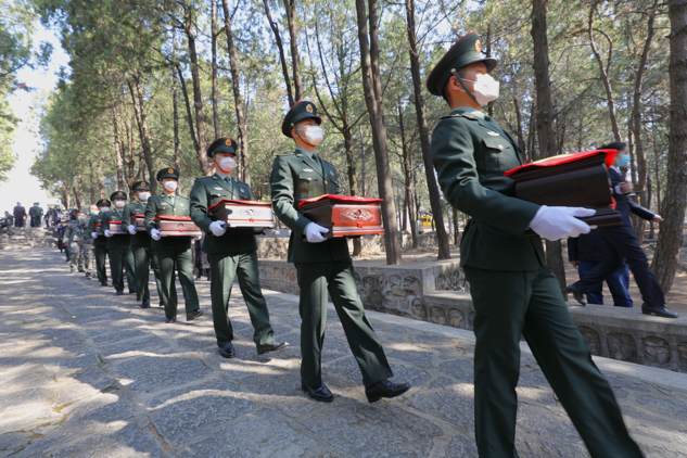 仪式上,与会嘉宾向革命烈士敬献了花篮,雄壮的国歌为现场增添了庄严的氛围,一纸祭文致于英烈灵前,全体人员脱帽,向革命烈士三鞠躬,由解放军战士护送的烈士棺椁覆盖着鲜艳的五星红旗,伴随着《思念曲》的音乐缓缓进入墓区,在烈士家属的注目下庄严下葬。