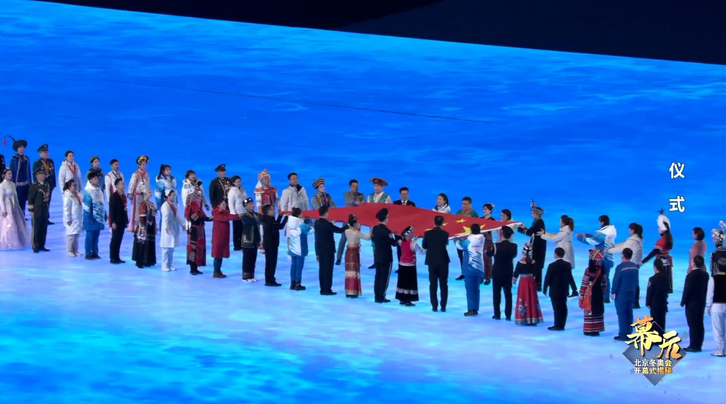 张艺谋:人民传递国旗的理念也是第一次用这样的方式来完成,因为国旗入场或者叫升国旗之前有一个简短的入场,怎么展示国旗也是一直是煞费苦心,冬奥会开幕式上很多点上强调了人民性,所以我就希望是这么两排人,都是由各行各业普通人,56个民族的代表以及国家楷模和精英,国家功勋的获得者等等。所有的优秀的人和普通的人组成了人民这样的一个概念。