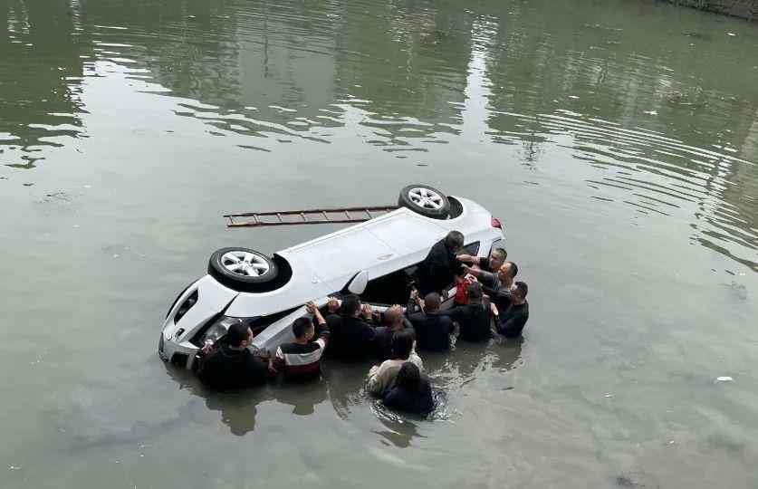 落水轿车中被困的三人