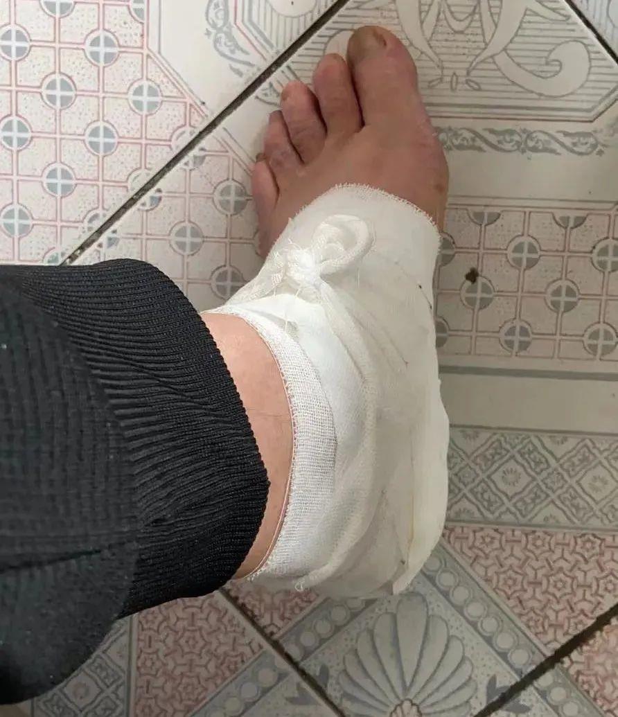 王明红的左脚被石头割伤