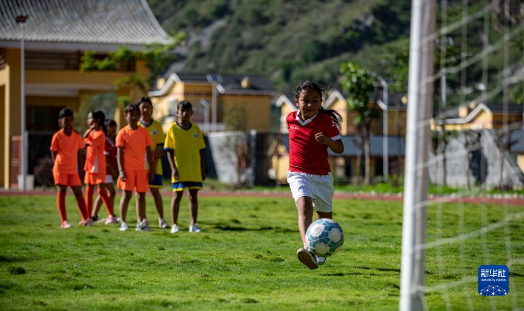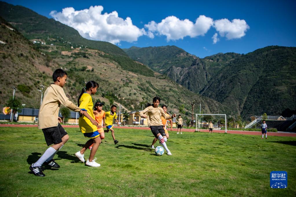 云南省怒江傈僳族自治州泸水市大兴地镇格力小学学生在球场上踢足球(2020年5月18日摄)。