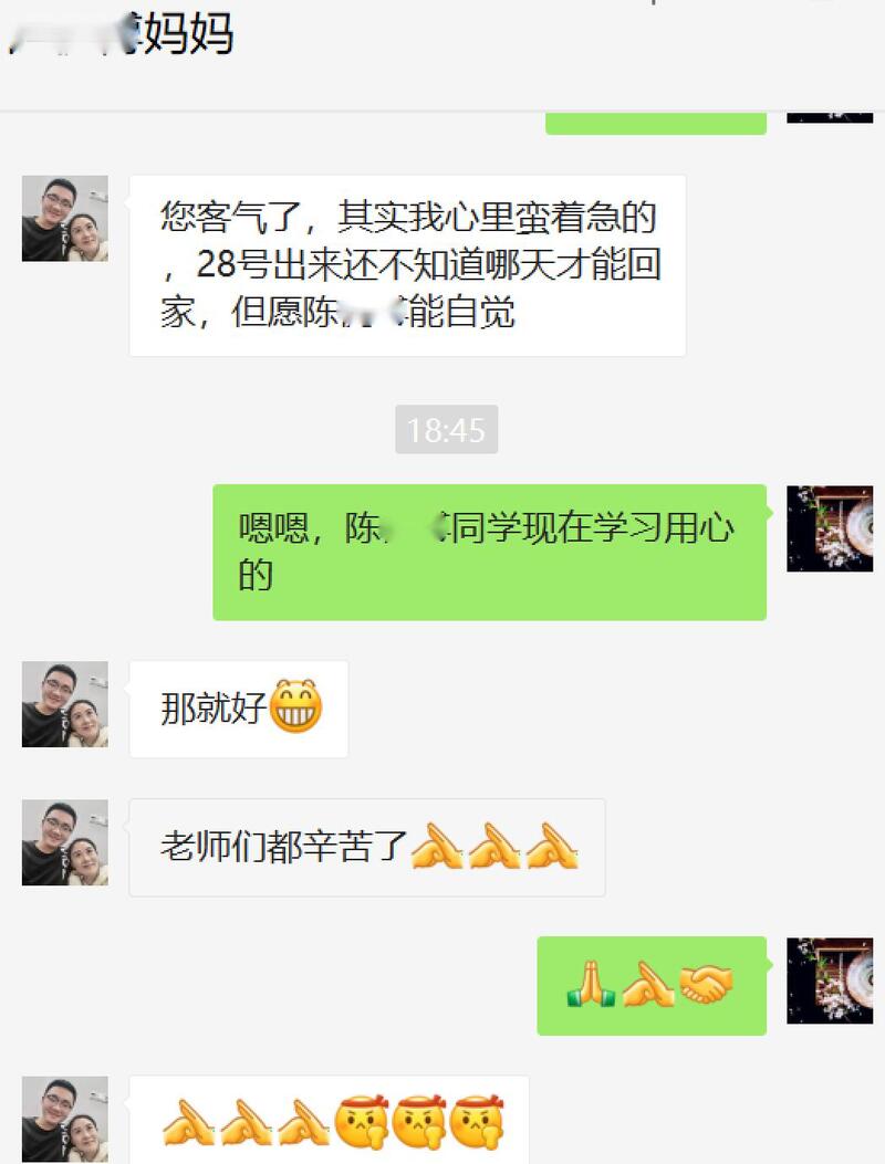“3月28日出去之后不知道什么时候才能回家,心里真的挺着急的,但好在有学校当我们的坚强后盾,”小陈妈妈说,“孩子有问题和老师沟通都能得到及时解决,也有校长点对点的沟通,让我们安心了许多。抗疫是我们应尽的义务,每个人做好自己的本职工作。感恩感谢陈校长以及所有老师对孩子的包容、照顾和指导。”