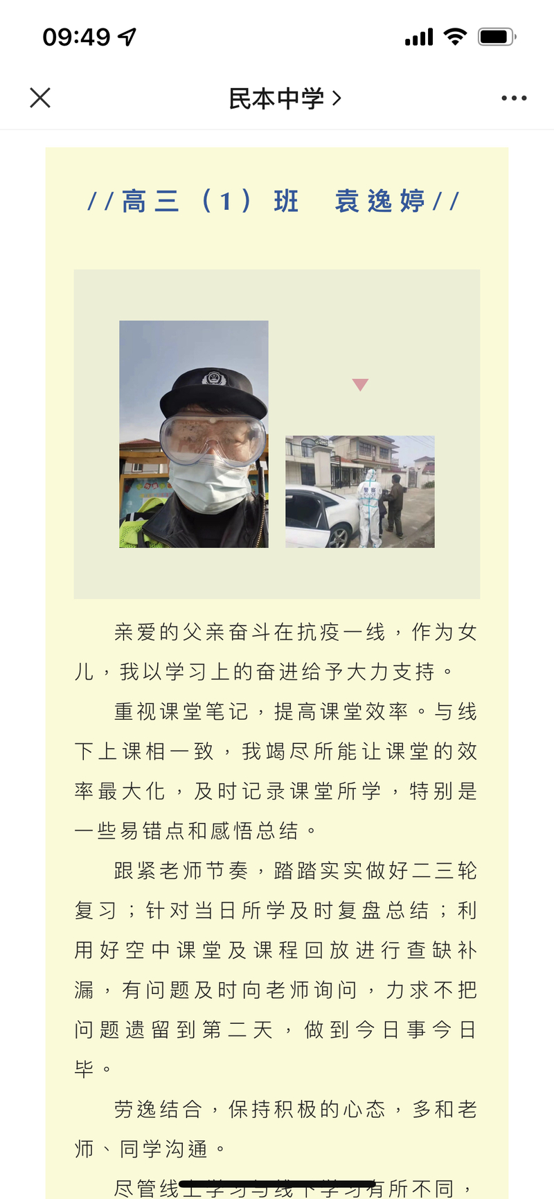 疫情下,民本中学有4名高三毕业班学生为“一线抗疫人员”子女,家长中有4位为一线医务人员,负责核酸采样工作,一名家长是隔离点的民警。学校团委组织了这样特殊的云端对话的方式,将家长的抗疫精神与学生迎接高考的历程相结合,开展祝福和寄语活动,通过学校微信公众号“隔空放送”。特别的爱给特别的你,使在一线抗疫的家长放心,也使高三的“一线抗疫人员”子女有充足的学习准备和积极的心理准备迎接灿烂的六月。