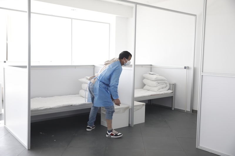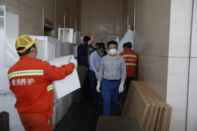 4月10日,现场施工总人数达170人,全面开启加速模式,上午完成5个楼层隔离仓的隔断、机电等安装工作,并进行了床单被褥铺装,局部已达到入住标准。4月11日下午,现场一片热火朝天,正进行清扫、保洁、补缺等最后的冲刺,包括黄浦区有关方面、云南省援沪医疗队的医护代表,已拿着图纸在现场就三区两通道等细节,提出符合疫情防控需求的专业意见。所有人,都在和时间赛跑!