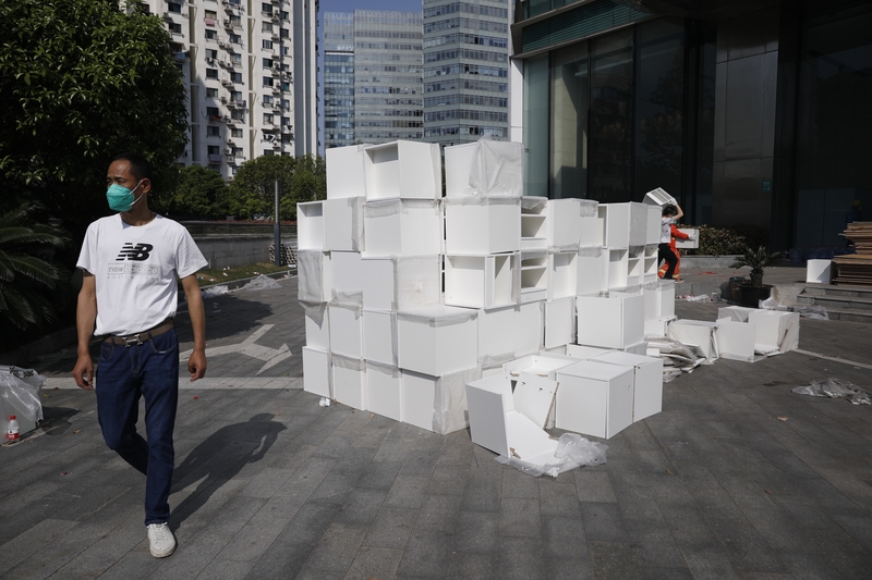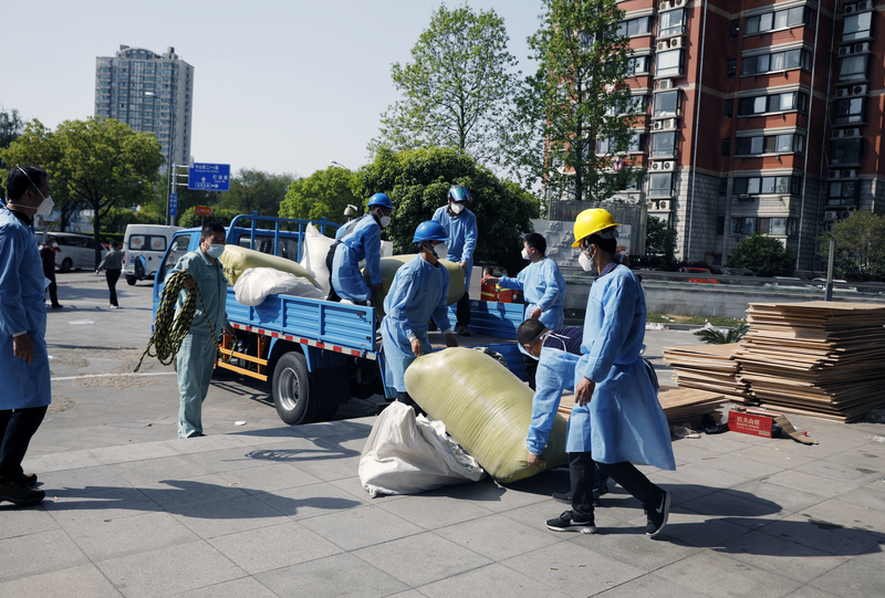 “嘿呦,嘿呦,加把劲哟!”瀛通大厦大堂前的广场上,阳光刺眼,空气灼人。床板、海绵、床头柜、被子等物资早已堆积成山,身穿蓝色简易防护服的工友们,正在挥汗如雨。“急人啊!把物资搬上楼,只能靠这6部电梯,蚂蚁搬家!”来自云南的林师傅,用发黄的毛巾抹了一把脸,“好困,一天一夜没睡了,再坚持下,今晚收工!”