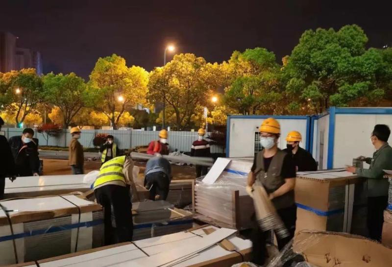 改建方舱,确实在和时间赛跑,在和病毒赛跑。面对重重困难与挑战,现场采用“螺蛳壳里做道场”的方法,利用现有场地条件,科学布置施工通道,并组织吊装单位通宵作业,全力加快材料进场。