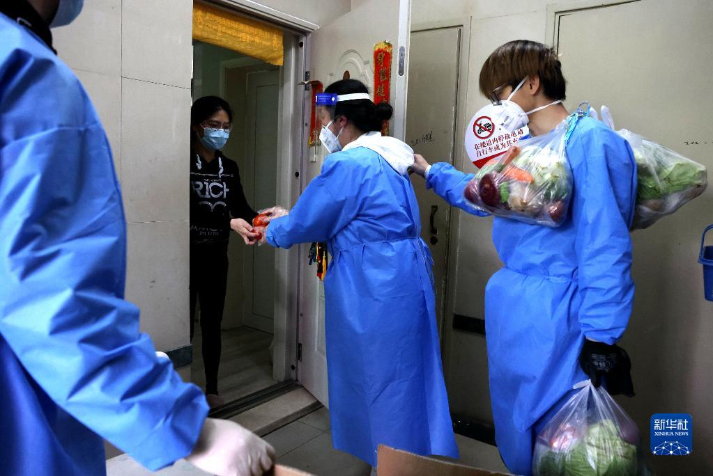 4月11日,社区志愿者为居民挨家挨户运送生活物资。新华社记者 陈飞 摄