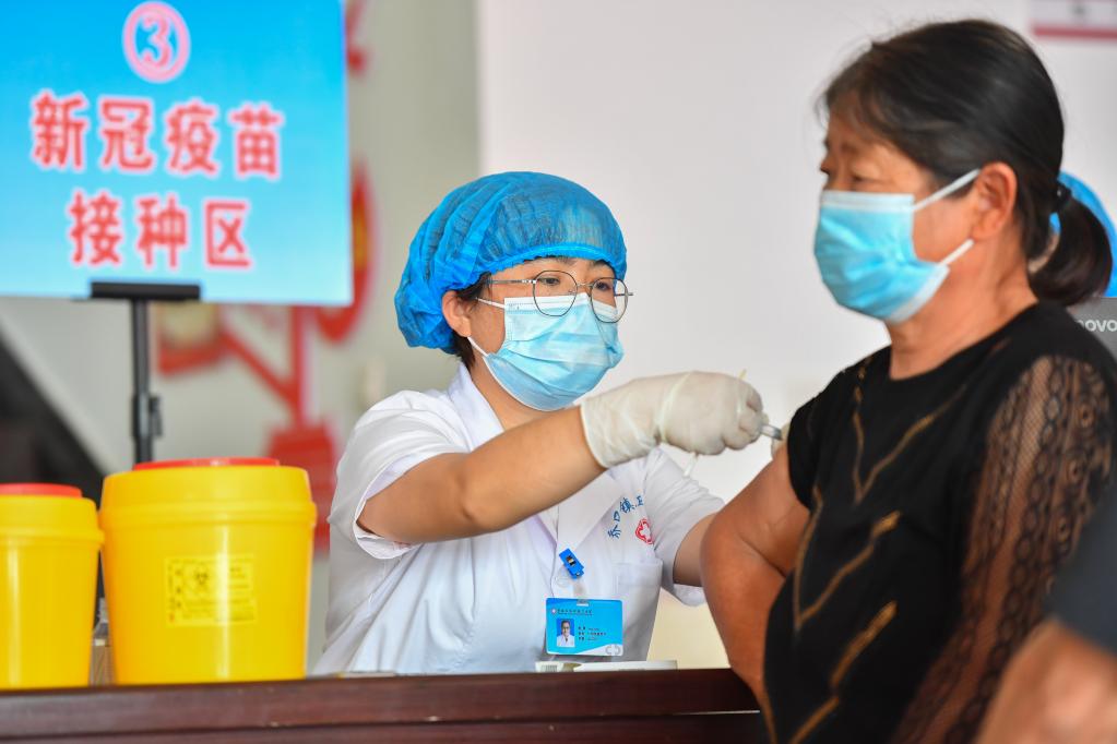 4月11日,在长沙市望城区乔口镇团头湖村的新冠疫苗临时接种点,医护人员为老年人接种新冠疫苗。(新华社记者陈泽国 摄)