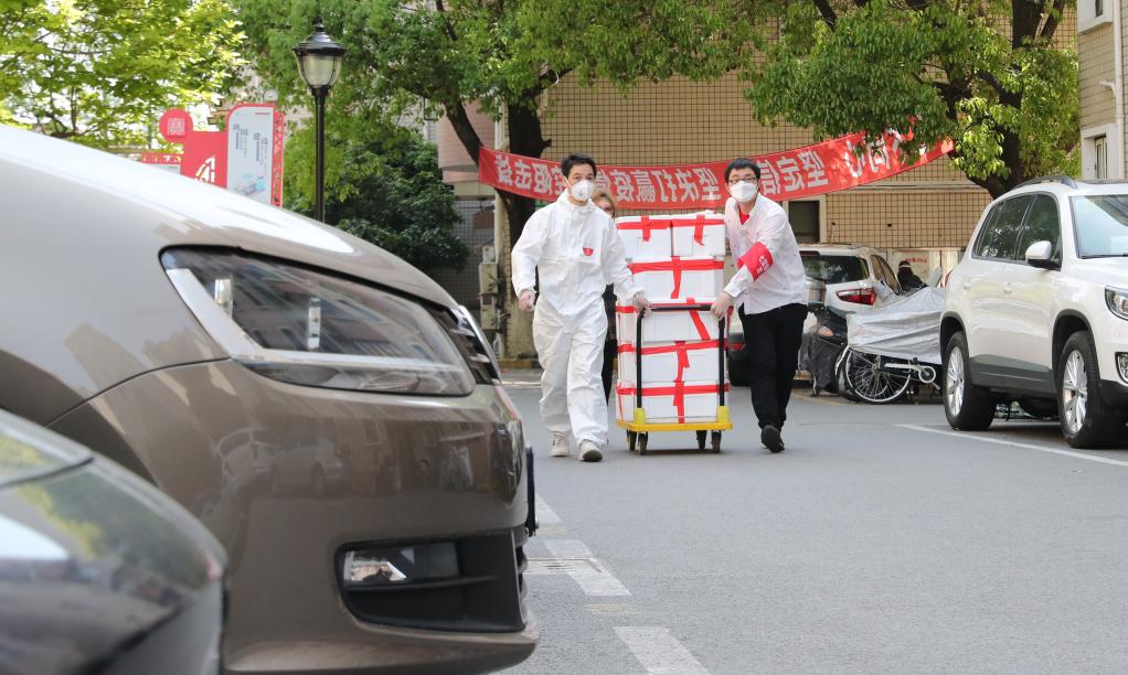 4月11日,上海市闵行区七宝镇社区志愿者施忠良(左)与他的志愿者伙伴一起为居民派送生活物资。(新华社记者方喆 摄)