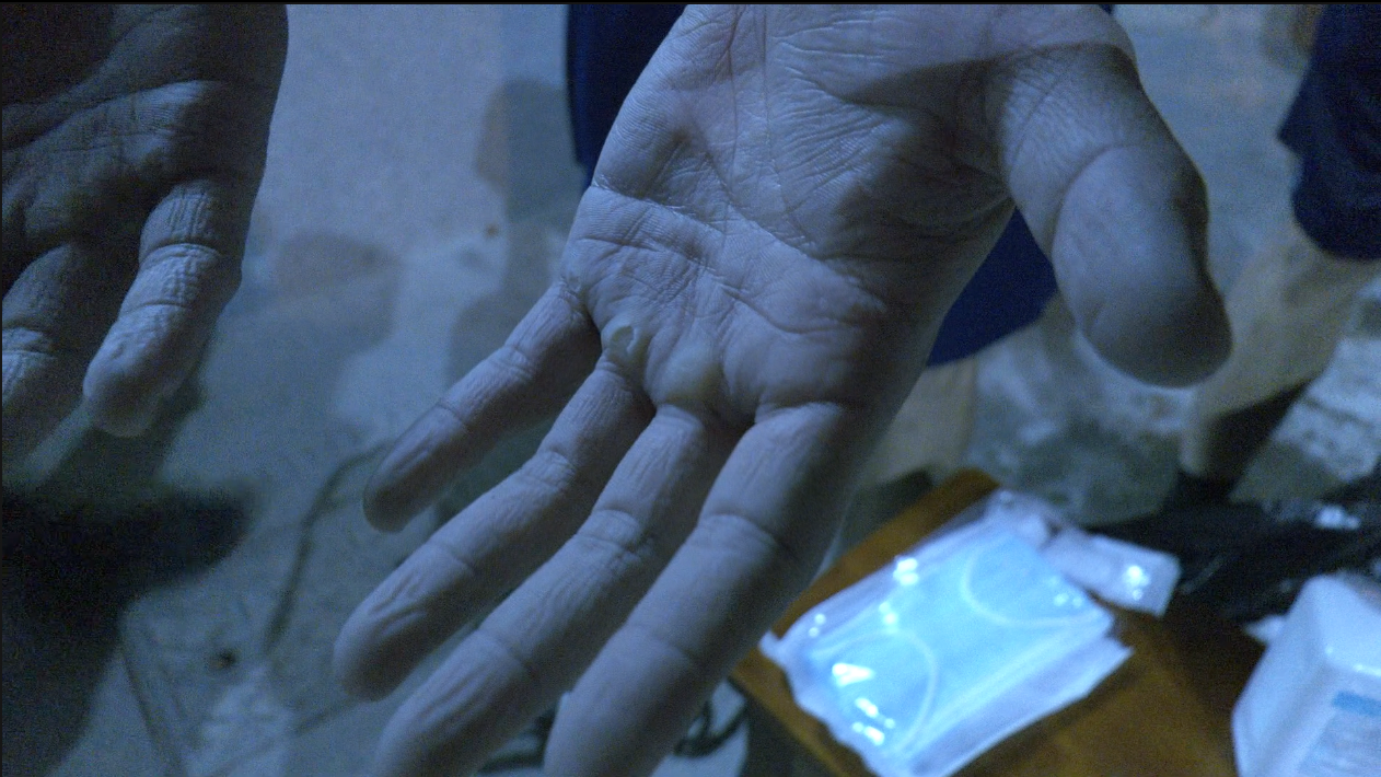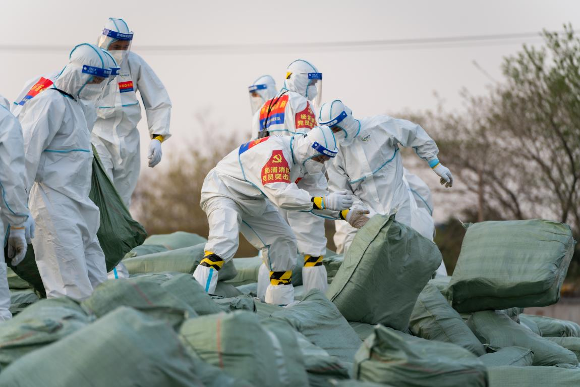 另外,梁瑞杰还带着他的先锋党员突击队的队员们化身物资“配送员”,这两天,从早上9时到晚上10时,他们穿着防护服,持续工作近13小时,为杨浦各个小区家庭配送生活物资。这天(4月12日)晚上九点半,正当忙了一天的队员们准备收车归队时,梁瑞杰又接到任务,还有一车物资需要转运,梁瑞杰和队员们二话不说又干了起来。由于搬运了一天,不停地起立弯腰,队员们只能时不时自己用手捶一捶。眼看着快要下雨,他们还有好几个小区的物资要转运,梁瑞杰一边给队员们加油鼓劲,一边调整队伍布置加快转运效率,终于在24点之前,带着队员们坐上了回队的车。回到队里,队员们开始进行后续的消毒工作。脱下穿了一天的防护服,摘下手套,因为在汗水里浸泡了一天,队员们的手有的发白起皱,有的磨起茧子、起了水泡。