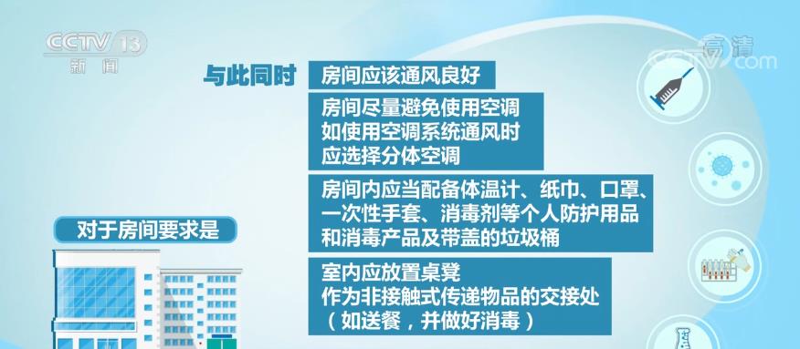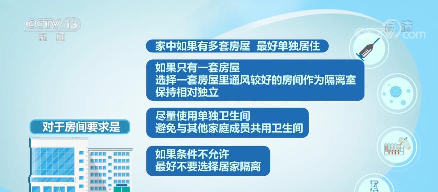 对于房间要求是,家中如果有多套房屋,最好单独居住;如果只有一套房屋,选择一套房屋里通风较好的房间作为隔离室,保持相对独立。尽量使用单独卫生间,避免与其他家庭成员共用卫生间。如果条件不允许,最好不要选择居家隔离。与此同时,房间应该通风良好;房间尽量避免使用空调,如使用空调系统通风时,应选择分体空调。房间内应当配备体温计、纸巾、口罩、一次性手套、消毒剂等个人防护用品和消毒产品及带盖的垃圾桶。室内应放置桌凳,作为非接触式传递物品的交接处(如送餐,并做好消毒)。