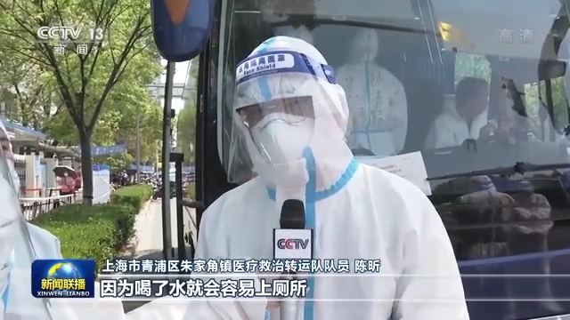 上海市青浦区朱家角镇医疗救治转运队队员 陈昕:一般我们出来水是不带的,因为喝了水就会容易上厕所,这个衣服一件也是很珍贵的,我们尽量就少换。然后基本上五六个小时之内的任务,我们能忍就忍一下。